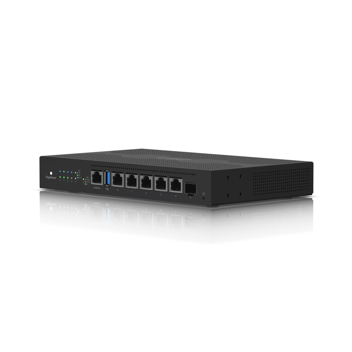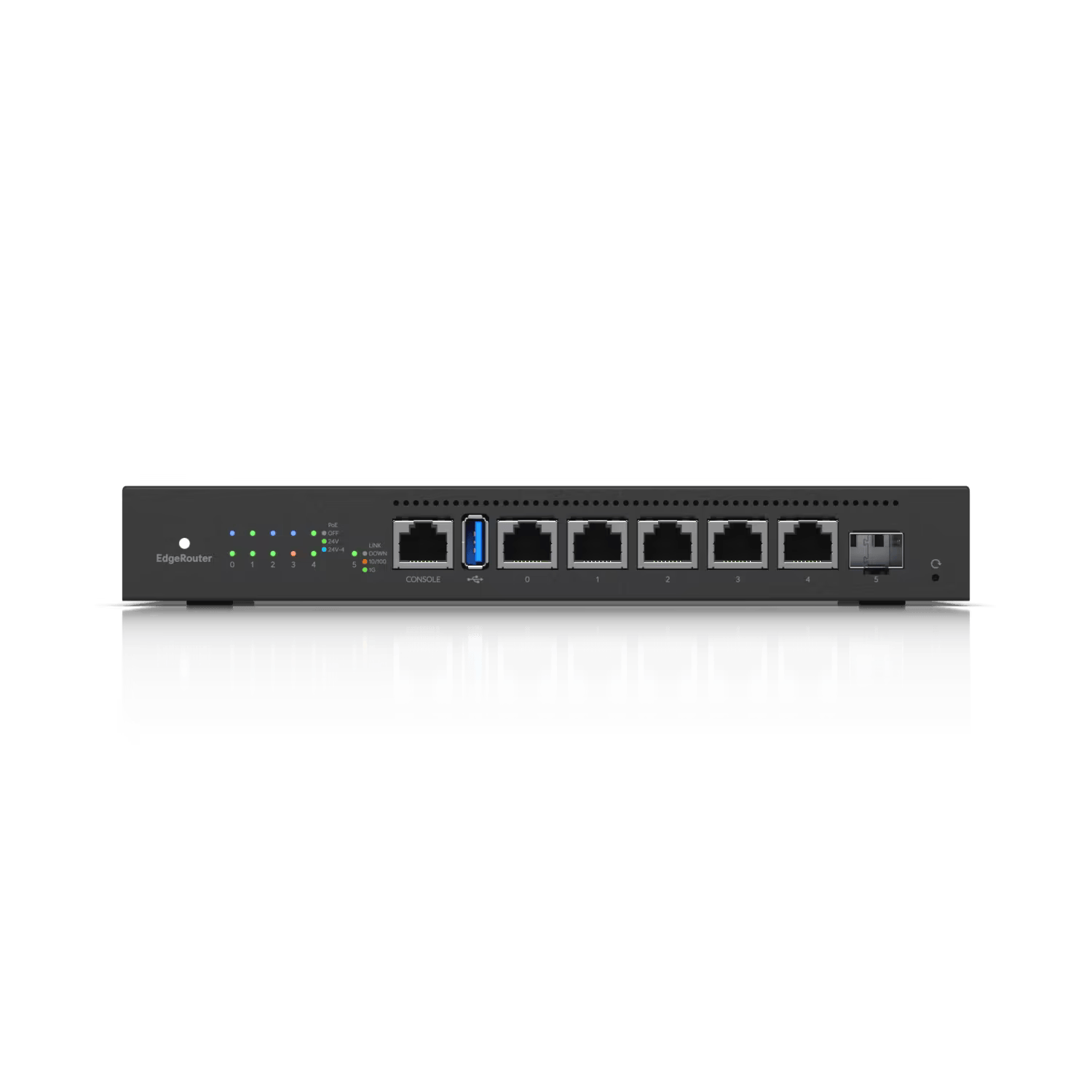 SWITCH EDGEROUTER UBIQUITI ER-6P. EdgeRouter 6 PoE pasivo 24 V, con 5 puertos 10/100/1000 Mbps + 1 puerto SFP, con funciones avanzadas de ruteo. Puertos: 5 puertos Gigabit Ethernet RJ45. 1 puerto SFP Gigabit. Throughput: 6 Gbps. Desempeño: 3.4 Mpps. PoE: 24 V Pasivo (2 y 4 pares). Características: Politicas de Firewall y NAT. Servicios de DHCP. Quality of Service (QoS). Herramientas de administración y monitoreo de red. Soporte de IPv6. Rutas estaticas. OSPF, RIP, BGP y MPLS. VLAN. VPN. Características generales: Alimentación: 110 – 240 VAC. Dimensiones: 229 x 136.5 x 31.1 mm. Peso: 730 g. Temperatura de Operación: -10°C a 50°C. Para montaje en Rack el accesorio se vende por separado ER-RMKIT.